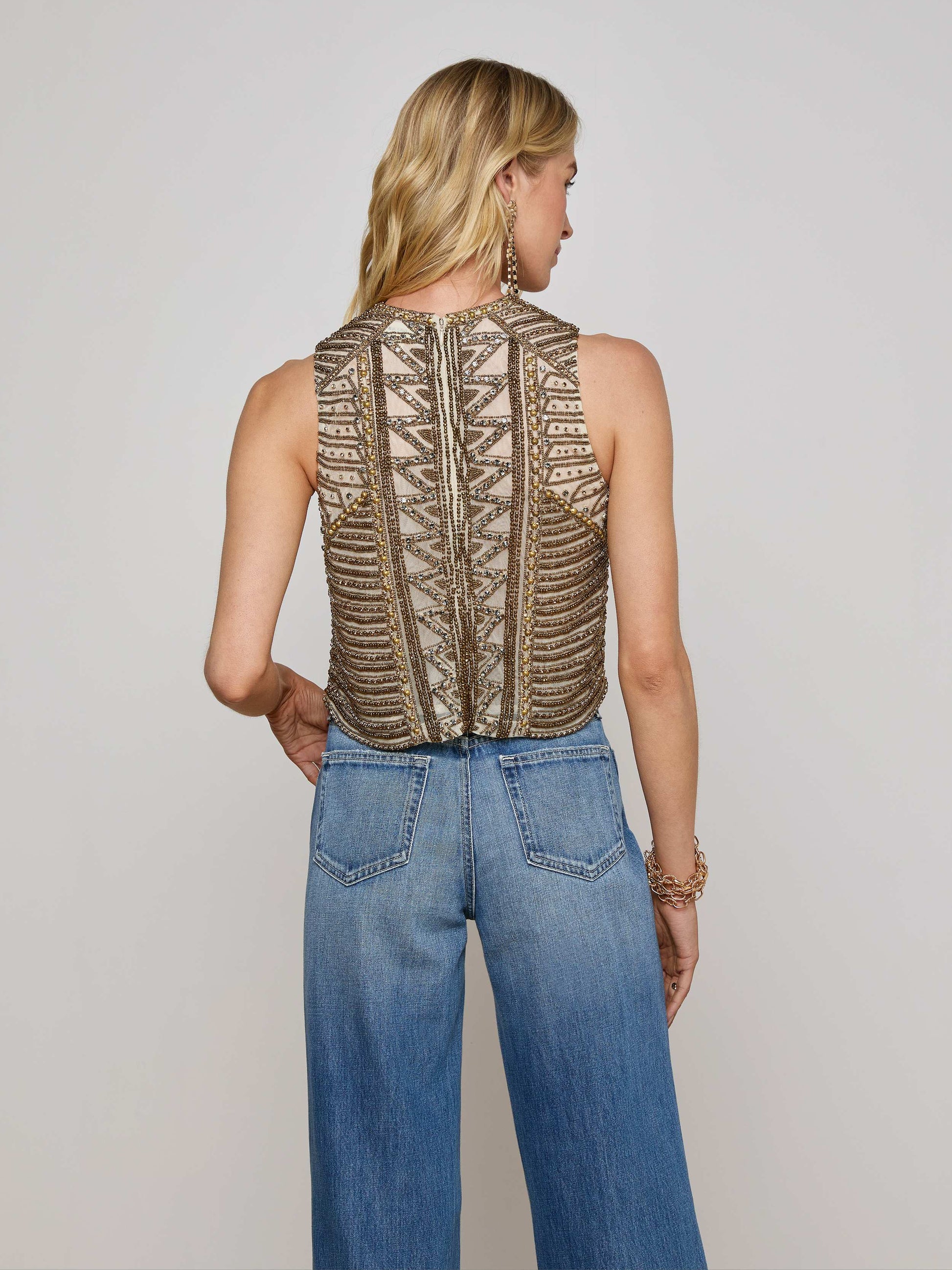 The Kienna stuns with its intricate beading, pearls, and sequins arranged in a striking geometric pattern. Each garment requires 6 days of meticulous sewing and beading to construct. This is the top to wear for your next event and every night out.