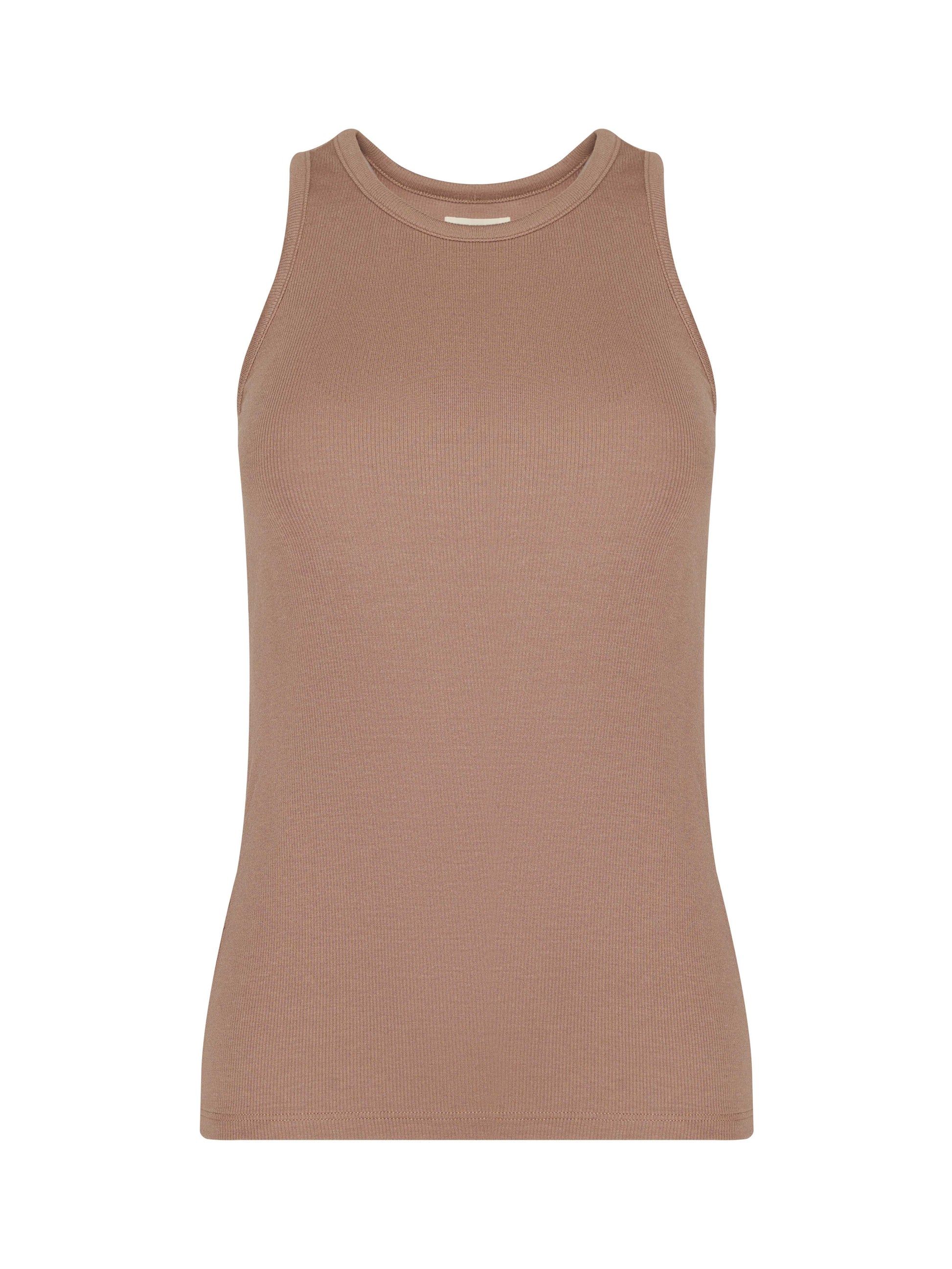 A sleek tank top crafted from ultra soft microfiber modal with cutaway armholes and a racerback silhouette. This wardrobe essential is perfect on its own or as a base for layered looks. Now in neutral tan.